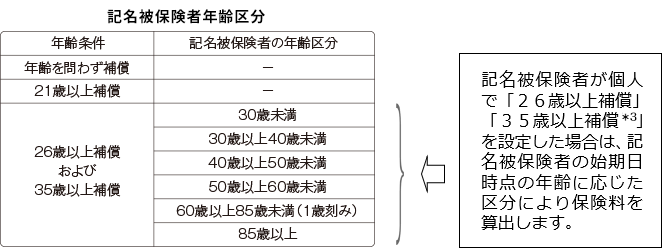 記名被保険者が個人で運転者の年齢条件「26歳以上補償」または「35歳以上補償*3」を設定した場合は、記名被保険者の始期日時点の年齢に応じて上記の表のように区分して保険料を算出します。