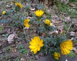 あるお宅の庭先、地面に近いところに「福寿草」が黄色い花を可憐に咲かせていました。声をかけさせていただき門から覗きこむように写真に…