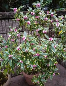 その先の道を歩いていると右手から芳香が、その香りに誘われて路地の奥へ入っていくと、門の外に鉢植えの「沈丁花」が咲き出していました。